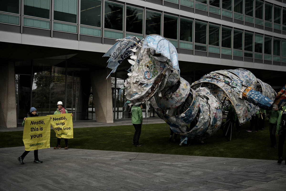 Les activistes de Greenpeace Afrique envoient un monstre en plastique à l'usine de Nestlé au Kenya